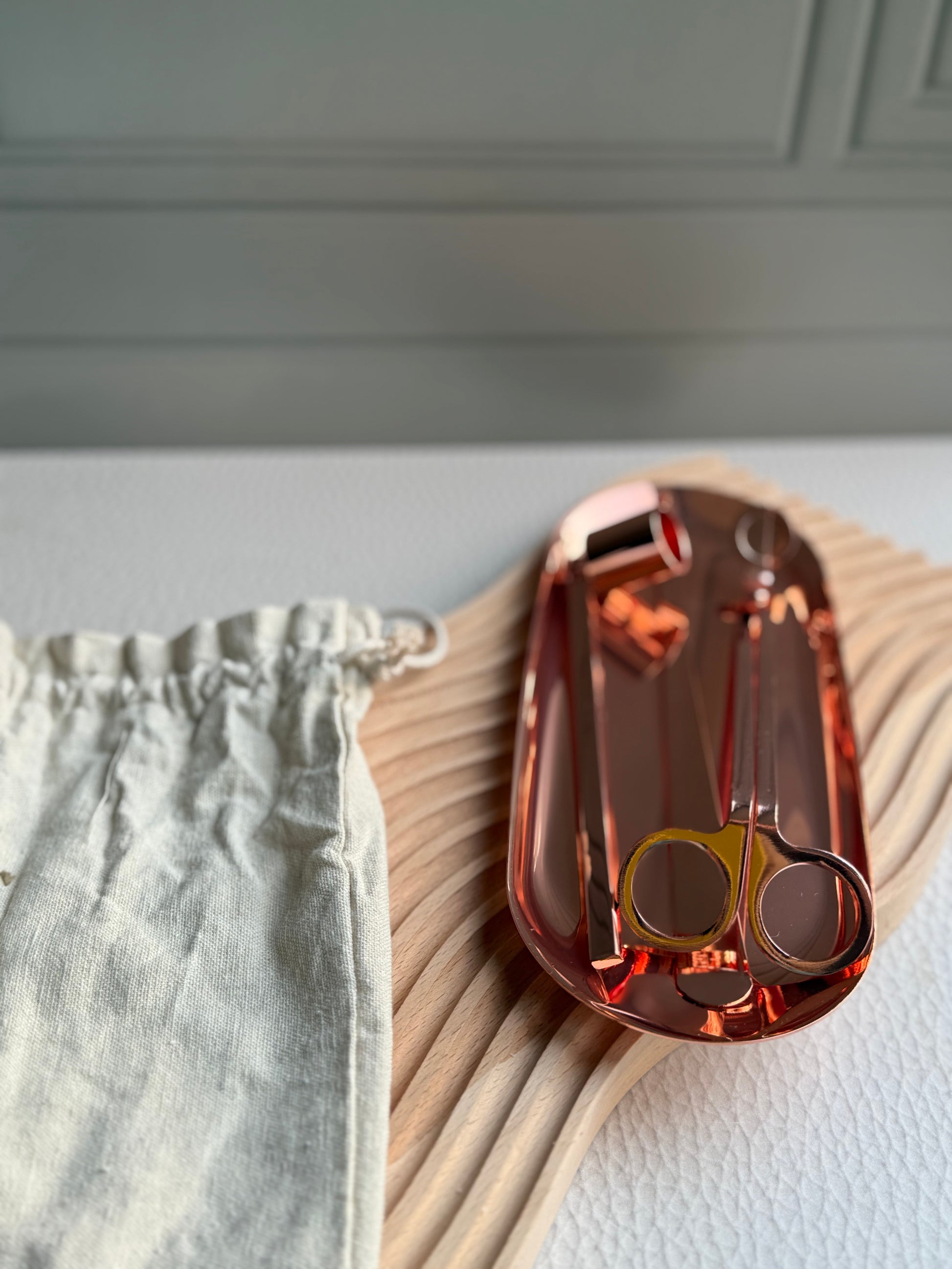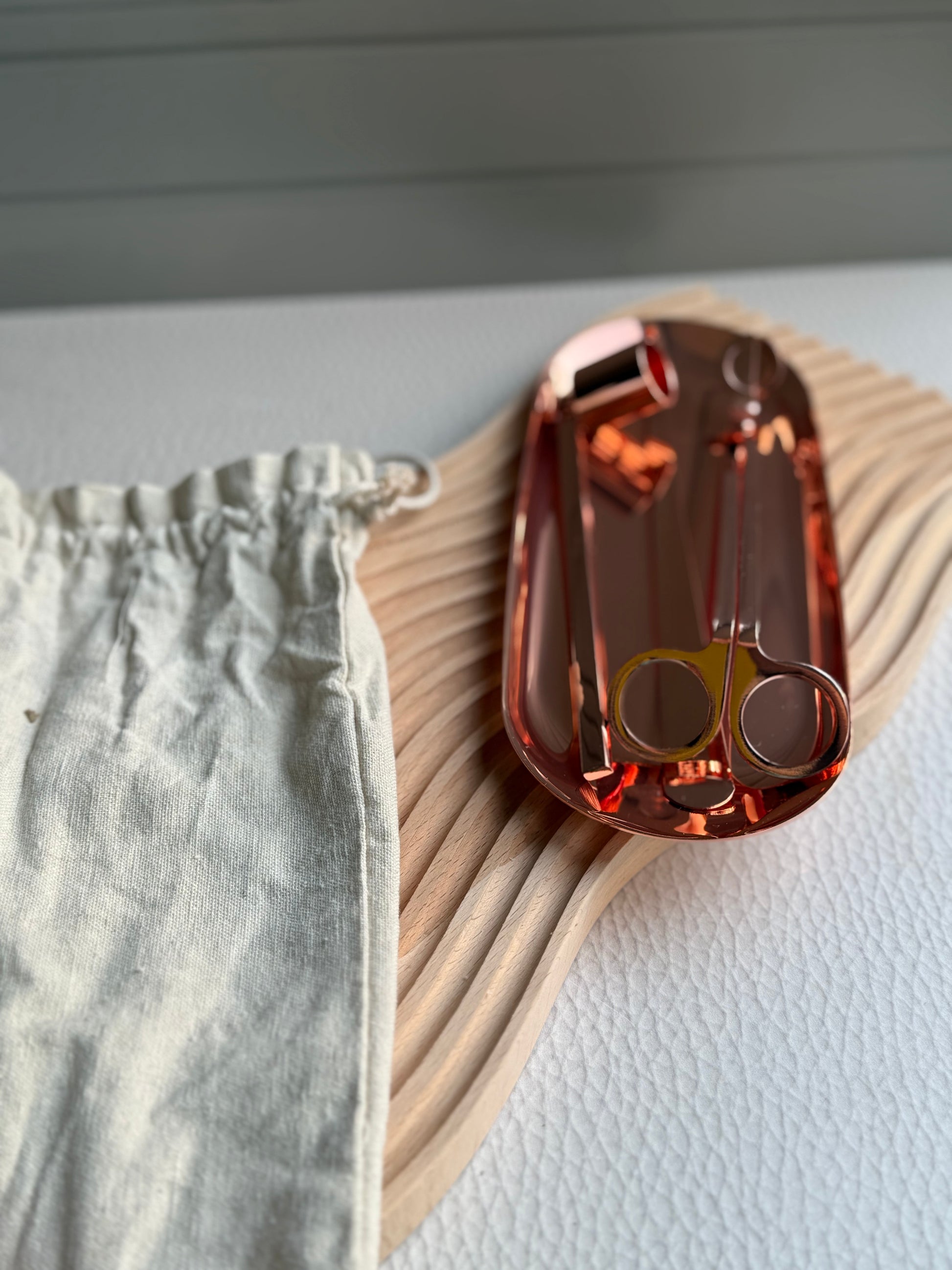 A nice quality candle kit , comes in a linen bag . The kit is made of 4 pieces , an oval plate , a wick trimmer , wick dipper and a candle snuffer .